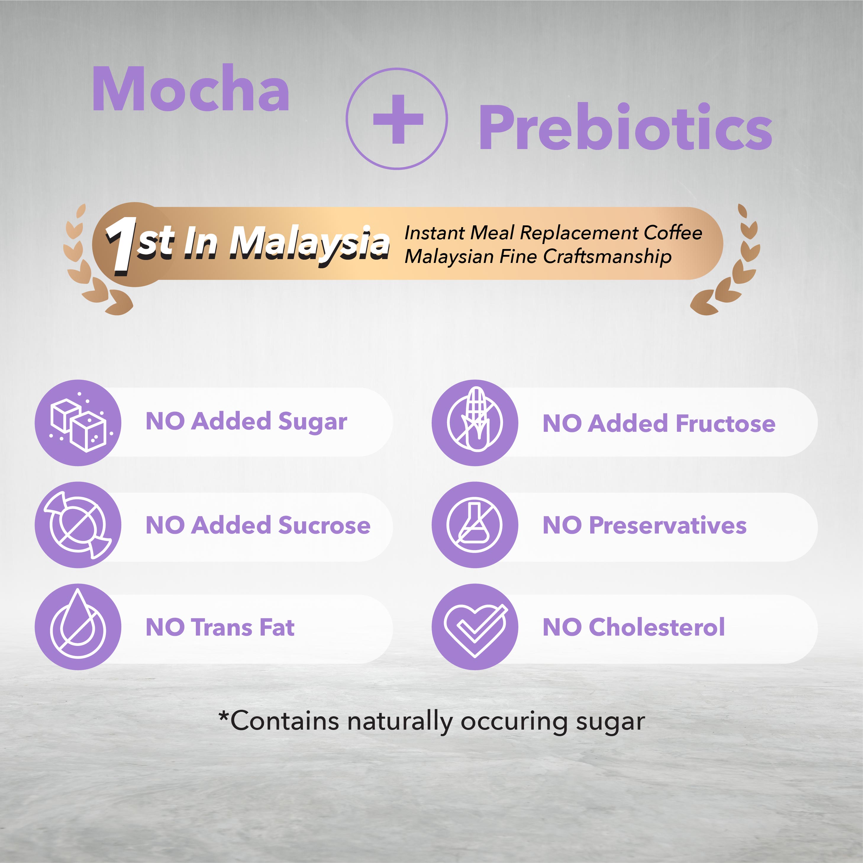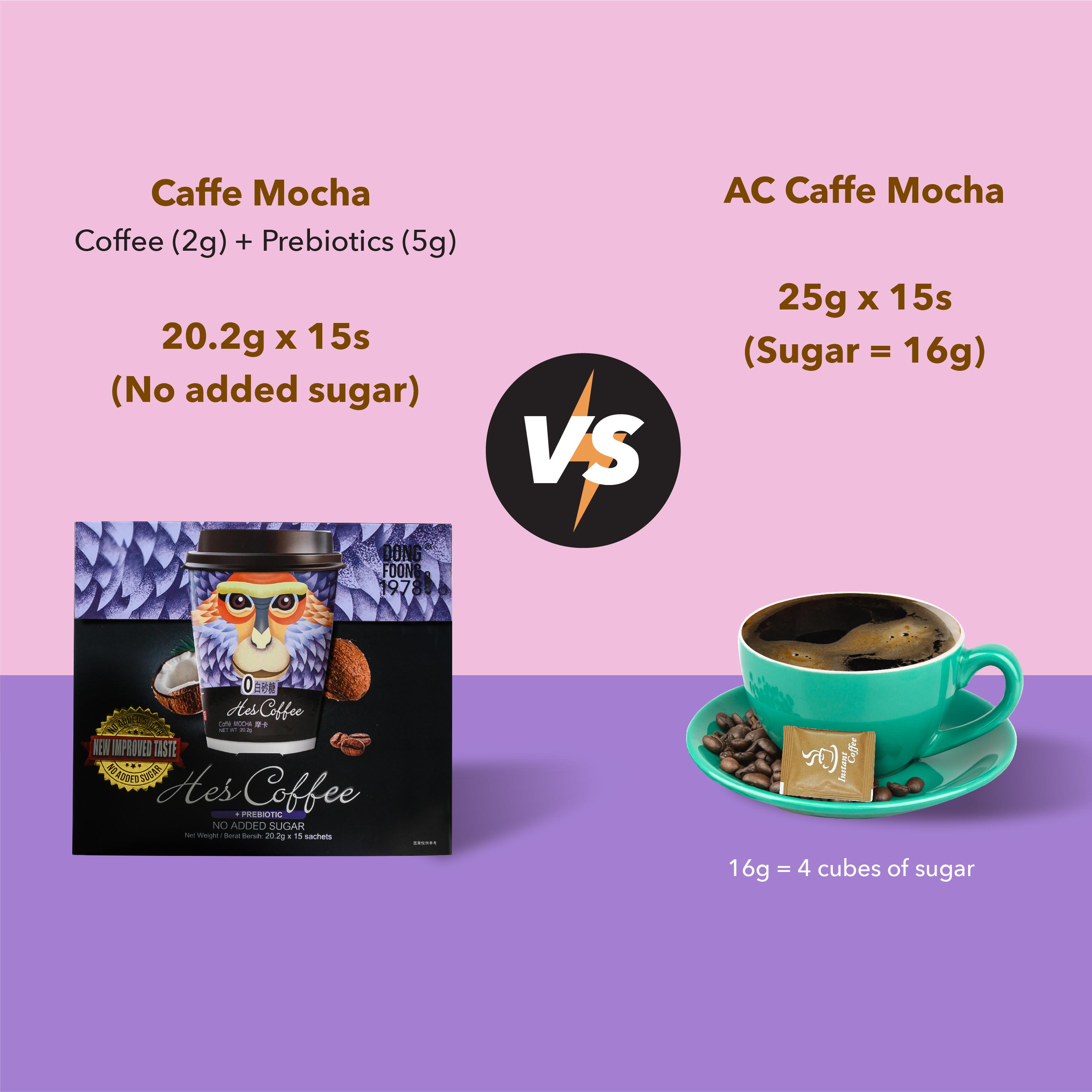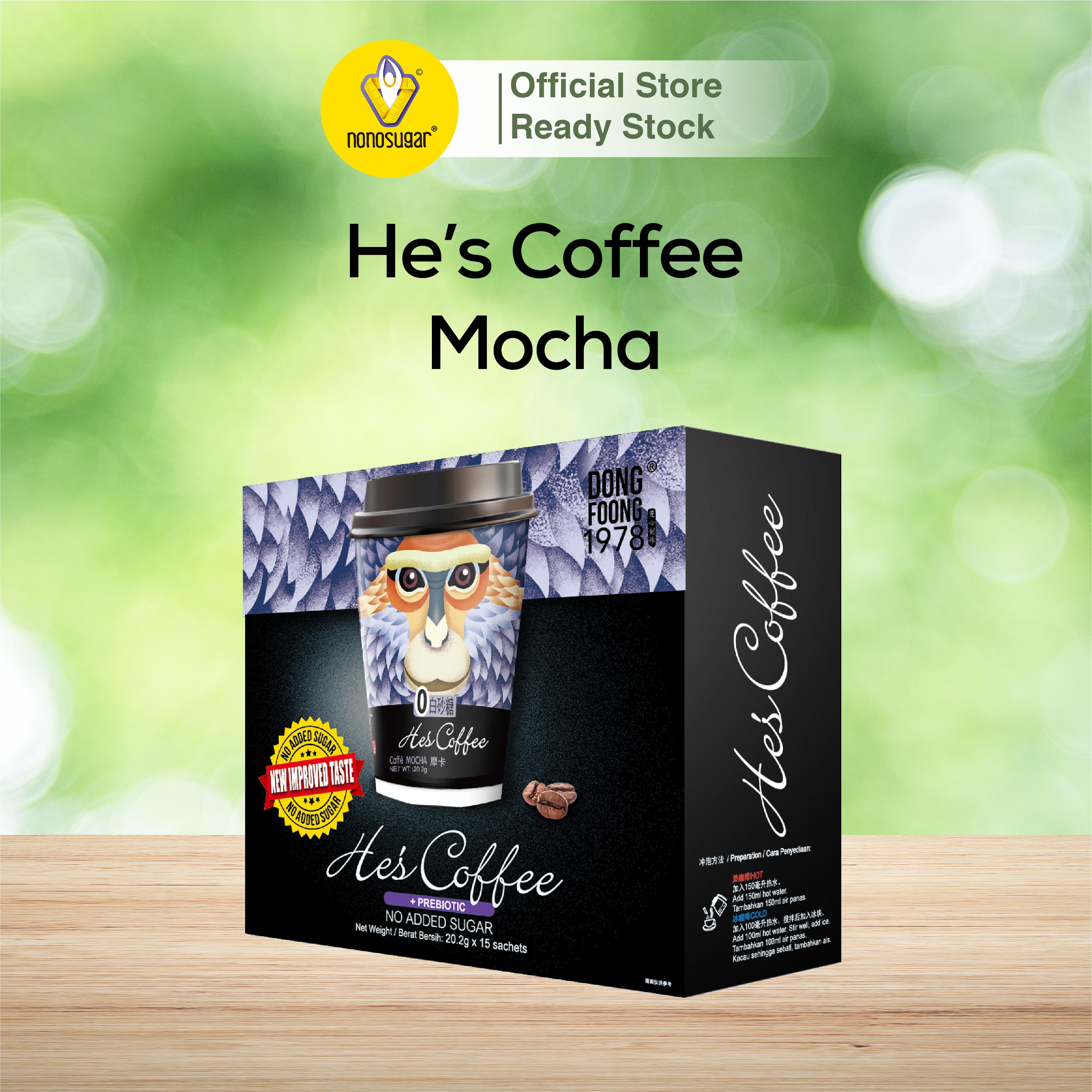 EXP DATE 15 AUGUST 2026 Heβs Coffee Caffe Mocha Dong Foong 1978 Heβs Coffee is a series of instant healthy coffee with no added sugar. To retain its great taste without sugar, Heβs Coffee contains a great deal of health promoting prebiotic, dietary fibre and authentic arabica coffee powder. Heβs Coffee comes in three variants β CaffΓ¨ Latte, CaffΓ¨ Mocha and Cappuccino. Heβs Coffee is a great beginnerβs step for coffee drinkers who are trying to kick the habit of drinking 3-in-1 coffee. Itβs a much healthier alternative to 3-in-1 because it has no added sugar! FEATURES NO white sugar, NO preservatives, NO trans fat and NO cholesterol! Prebiotics for gut health: Heβs Coffee contains inulin which is a type of soluble fibre and a fructan; it feeds the good bacteria in our digestive system. Ethiopian Arabica beans: Made from slow-roasted beans with rich and aromatic flavours, high acidity and mild bitterness. BENEFITS Boosts energy levels Provides gut nourishment Supports a sugar-conscious diet