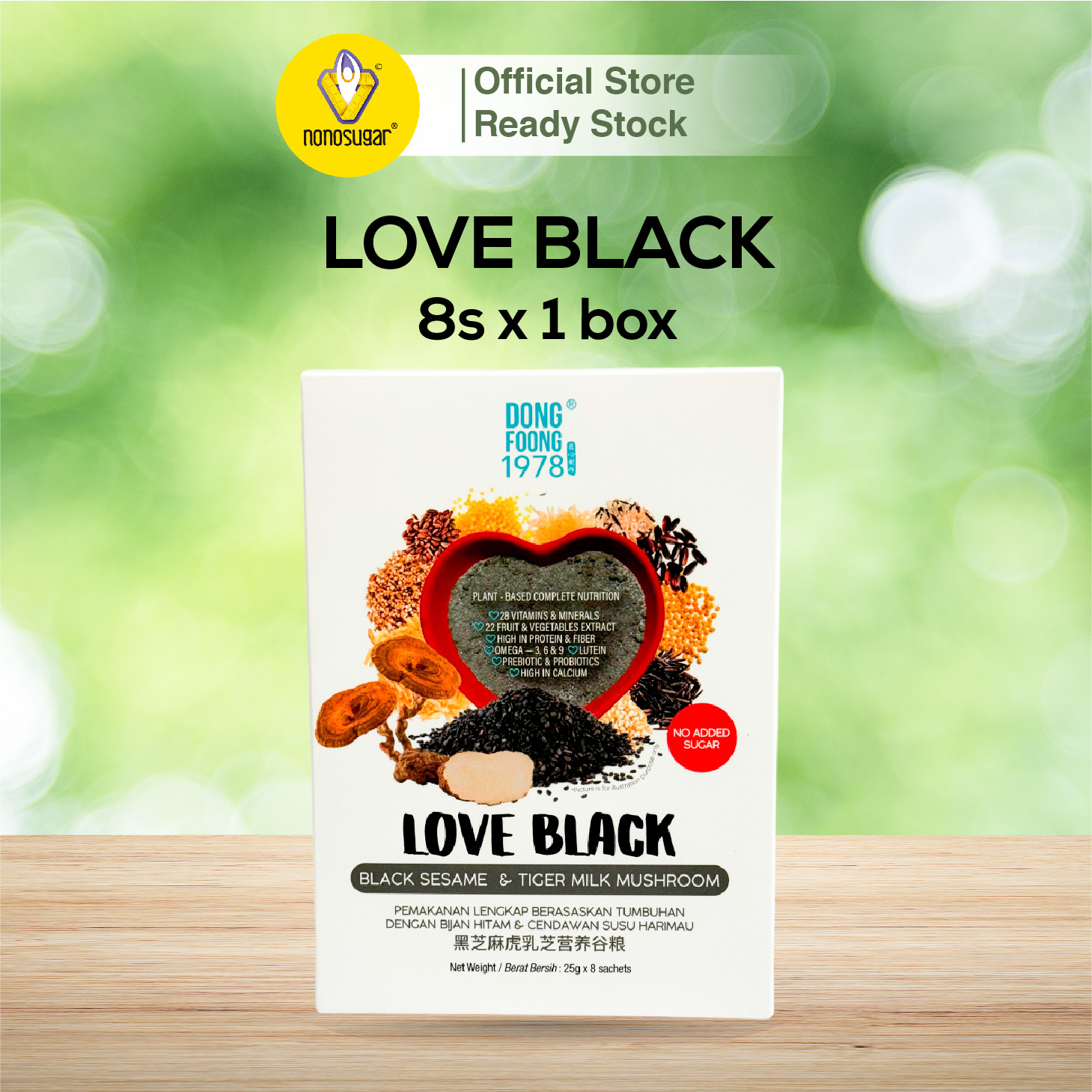 LOVE BLACK Black Sesame & Tiger Milk Mushroom 8's x 25g per Box LOVE BLACK Black Sesame & Tiger Milk Mushroom is passionately formulated with NO ADDED SUGAR to build your nutritional foundation for strength and vitality required for an active lifestyle. A plant-based complete nutrition, Love Black is packed with: β Wholesome grains β 22 types of fruit & vegetable concentrate β 28 types of vitamins & minerals β Omega 3, 6 & 9 β Prebiotic & probiotics β Lutein β High in both fibre & protein β Black sesame & tiger milk mushroom While the black sesame improves the health of your hair, nails and bones, the tiger milk mushroom boosts your immune system. Love Black is lactose free. It can be a very useful companion as a nutrition supplement or meal replacement for your healthy weight loss journey.
