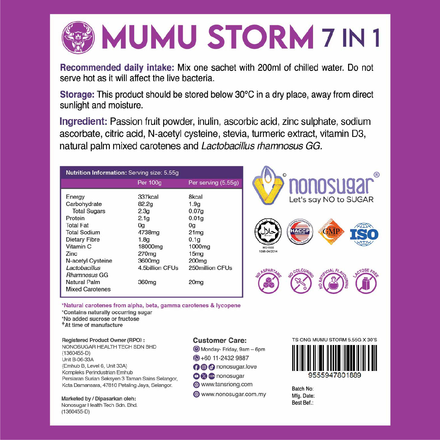 EXP DATE 27 AUG 2026 MUMU STORM Introducing MUMU STORM, the ultimate 7-in-1 Vitamin C supplement that offers the strongest protection for you and your loved ones! With 7 essential nutrients, including Vitamin C, Zinc, Vitamin D3, N-Acetyl Cysteine (NAC), Pre Probiotics LGGยฎ, Turmeric extract, and Passion Fruit extract, this supplement provides 24-hour protection against viruses, germs, and bacteria. MUMU STORM is best served chilled. Many of our customers use it to toast at special VIP events as it a non-alcoholic bubbly drink with no added sugar. Celebrate your event and toast to good health with MUMU STORM today! Frequently Asked Questions: 1. Q: Does MUMU STORM contain sugar? A: No, MUMU STORM does not contain added sugar. 2. Q: How long should I take MUMU STORM for? A: You may take MUMU STORM daily for the long term. With its 24-hour immunity and 7-day protection, you can enjoy the benefits of MUMU STORM every day. 100% natural with โ NO ADDED SUGAR โ NO ADDED FRUCTOSE โ NO ADDED SUCROSE โ NO ASPARTAME โ NO COLOURING โ NO ARTIFICIAL FLAVOURING โ NO PRESERVATIVES โ SOY-FREE โ GLUTEN-FREE โ DAIRY-FREE ๐๐ผ Suitable for adults and children, ages 12 years and above