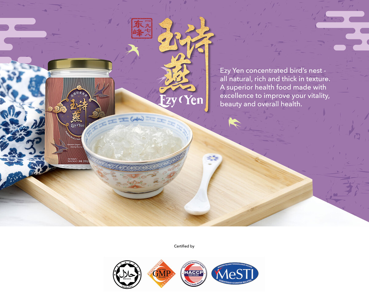 EZY YEN Instant Bird's Nest Concentrate Enjoy the goodness of Birdβs Nest, the EZY way. Ezy Yen is prepared with birdβs nests derived naturally from Golden Thread Swiflets (Apodidae: Collocalia). It is rich in high quality and easily absorbed nutrients. It has been scientifically proven to contain bio-active protein, trace minerals and micro nutrients which are essential to our health. Ezy Yen is manufactured by the latest technology under strict Good Manufacturing Practice (GMP) and HACCP standards. This product is also treated with state-of-the-art high temperature sterilization methods to ensure Ezy Yen is safe, hygienic and of highest quality. Ezy Yen is a truly nourishing food for the whole family. It is so convenient to be taken straight or mixed with your favorite warm or cold drinks.