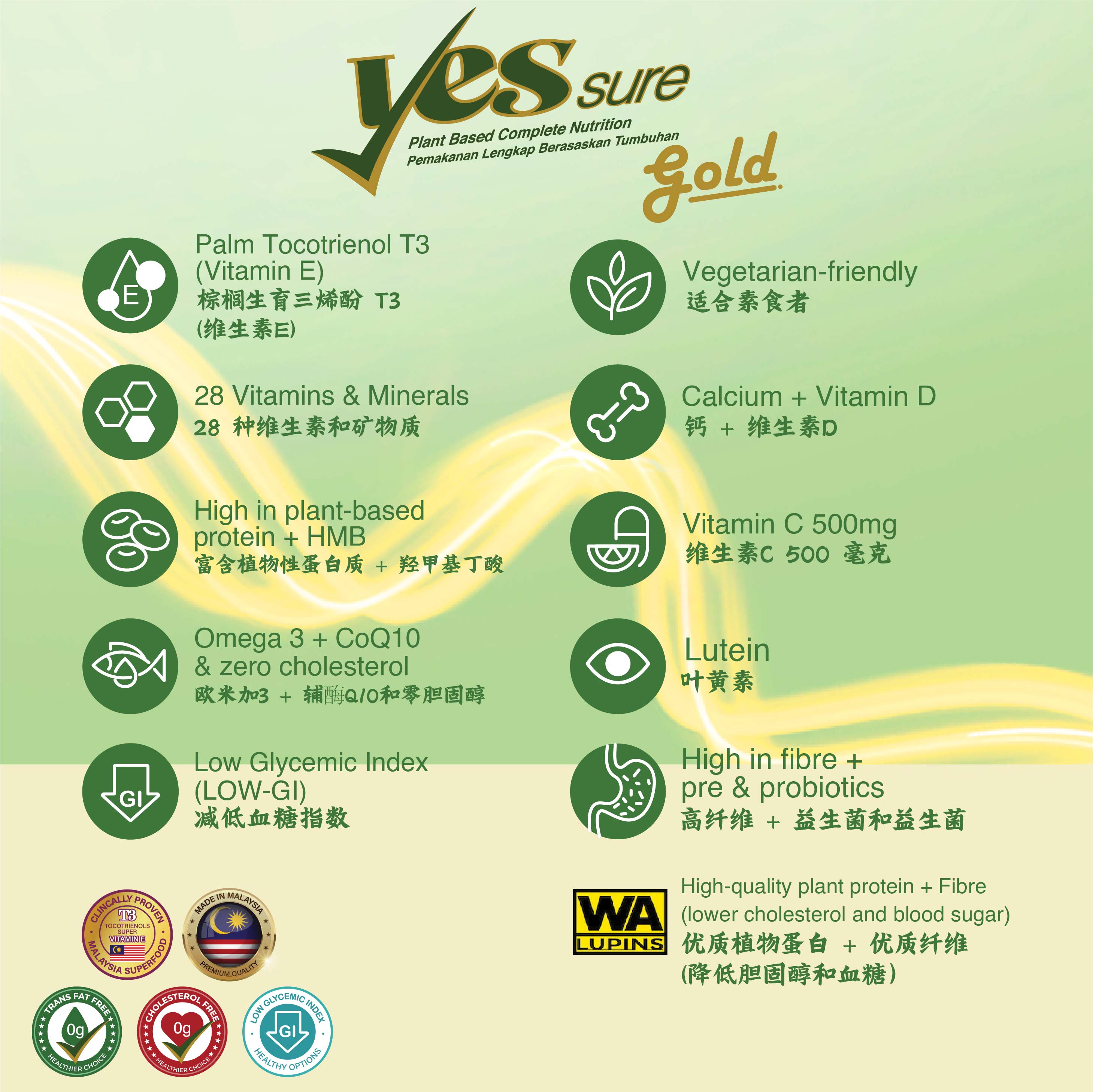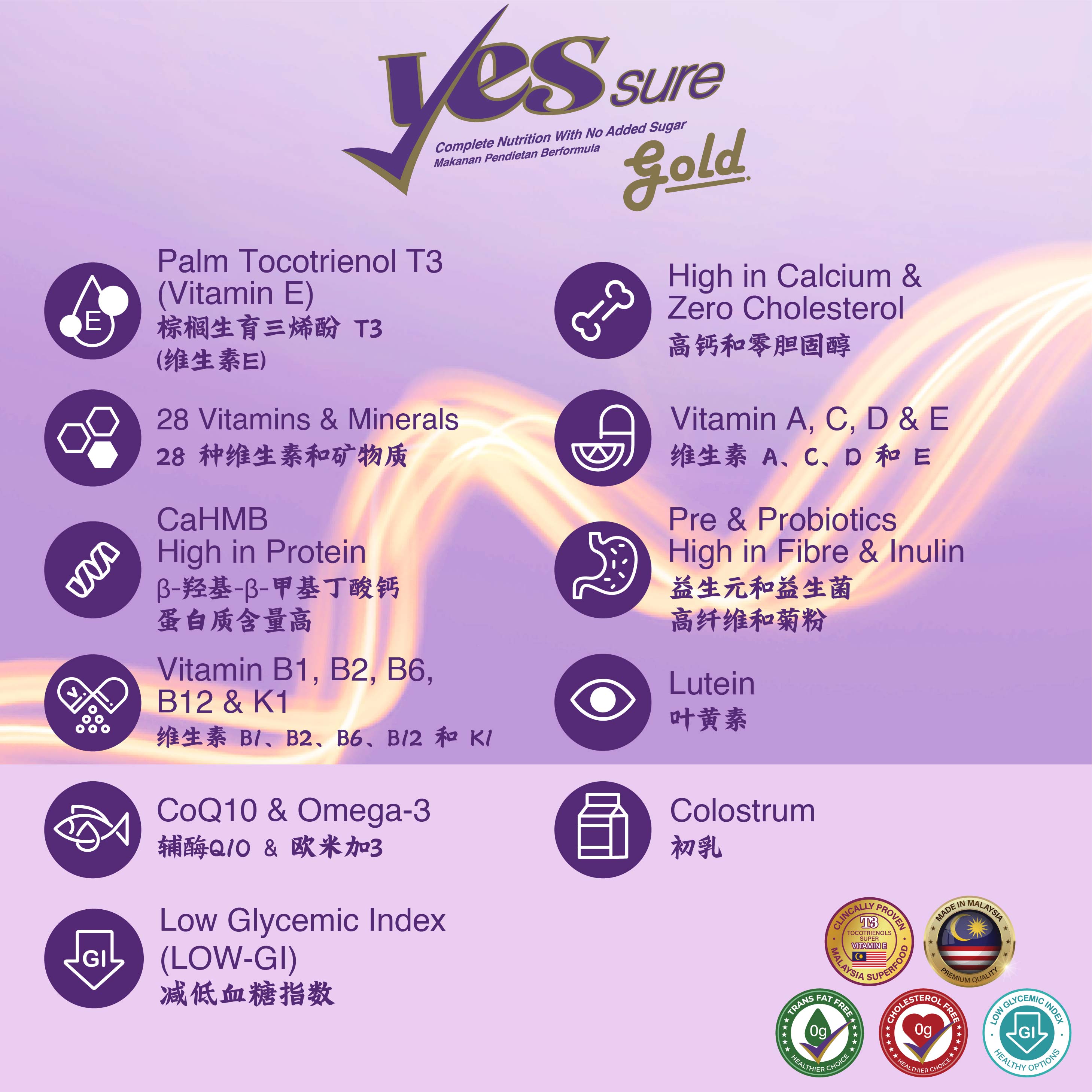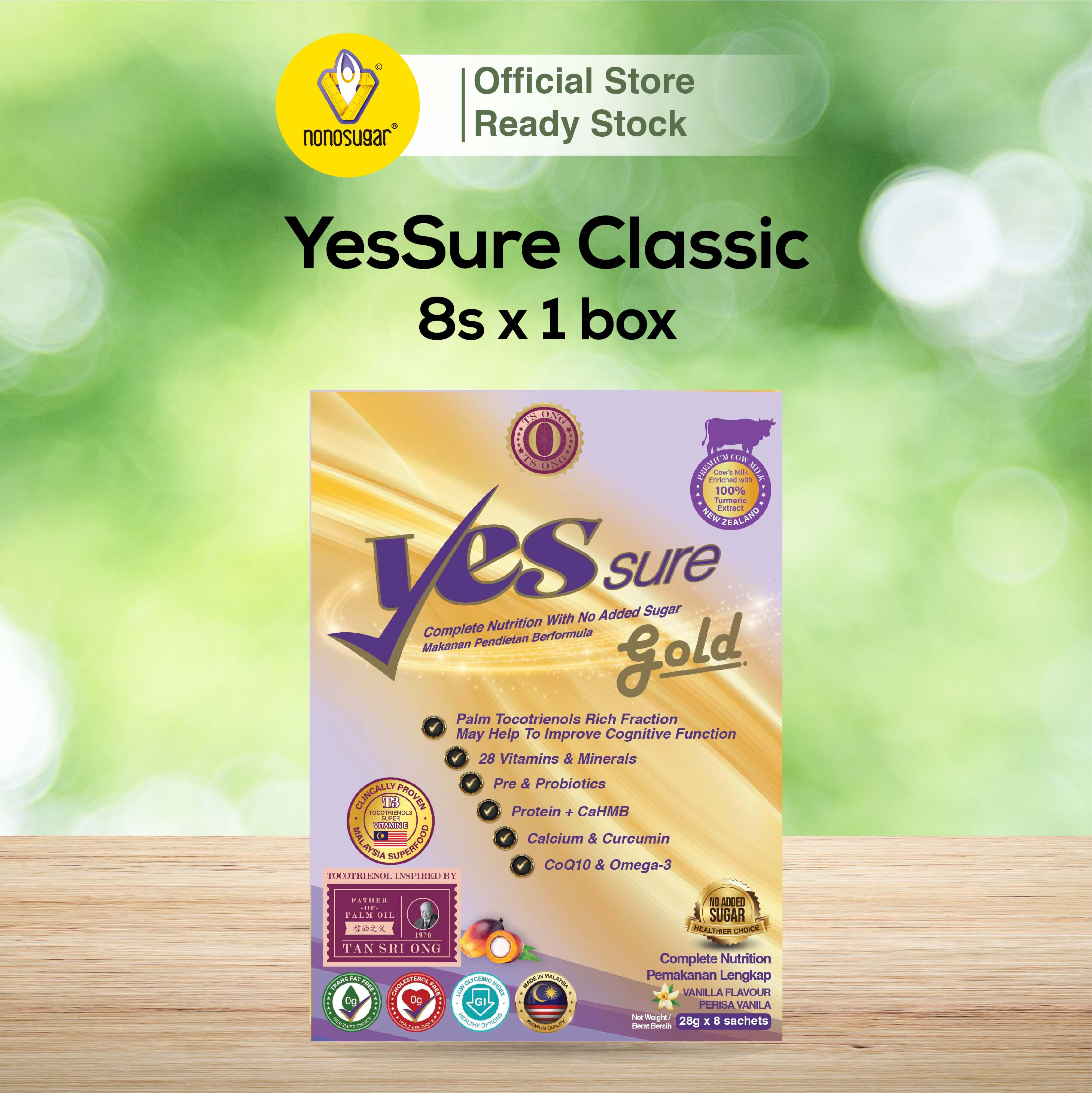 Meet your daily nutritional requirements with YesSure Gold! Specially formulated to provide a solid nutritional foundation, giving you the strength & vitality to lead an active lifestyle. First in Malaysia with turmeric extract. The improved formula is now enriched with Palm Tocotrienol Rich Fraction, which may help improve cognitive functions as certified by Kementerian Kesihatan Malaysia (KKM).